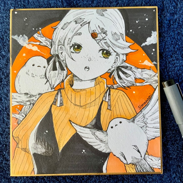 【サイズ】色紙サイズ(13、5×12cm) 【使用画材】コピック、コピックマルチライナー、ホワイトインク 【状態】新品・未使用 オレンジ色を主体に、あたたかみのある雰囲気に仕上げた色紙原画。 ペンで細かく描き込んだ、シマエナガとそばかすの女の子の絵です。 背景には黒とオレンジのコントラストを入れ、秋らしい色合いを意識しました。 インテリアとして飾っても楽しんでいただけると思います。 手描きの一点物ですので、写真と実物で多少色味が異なる場合があります。 丁寧に梱包して発送いたします。
