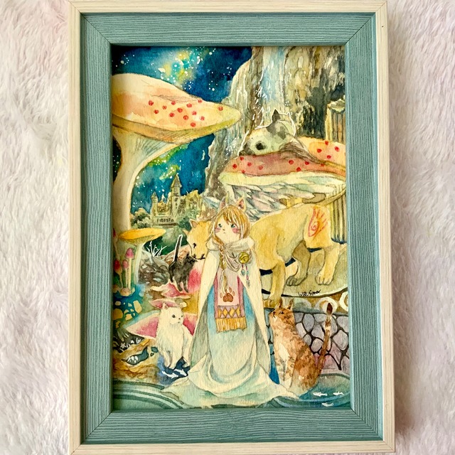 サイズ 175×124mm(ハガキサイズ) 画材 透明水彩、色鉛筆、シャーペン、ホワイトインク 幻想的な輝く星空の下に広がる「猫の王国」。 猫耳を持つ少女と、彼女を守る優しい猫たちが暮らす世界を描いたファンタジックな水彩画です。 巨大なキノコや不思議な光が漂う風景の中に、どこか不思議で懐かしく、温かな物語を感じていただけます。額装有り。