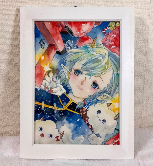 【作品サイズ】 400×295mm 【画材】 透明水彩、色鉛筆、顔彩、ホワイトインク、ビーズ 天空の王国へ ― 透明水彩による幻想の旅路 柔らかな光と色が溶け合う空の果て。 翼を広げたドラゴンが、ひとりの少女を背に、雲の上の王国を目指して翔けていきます。 透明水彩ならではの繊細なグラデーションが、空気と光を感じさせ、 滲みと透明感が幻想的な世界を静かに描き出します。 画面の中には、惑星や星々をイメージしたビーズが散りばめられ、 見る角度によって微かに光を返すその輝きが、作品に奥行きと命を与えます。 ファンタジーの世界観を丁寧に構築しながらも、どこか現実の空にも似た光の表現が、 観る者の心を優しく包み込むような一枚です。 ビーズを貼り付けていますので 原画のカバーはつけておりません。 湿気のないところに飾ってください。