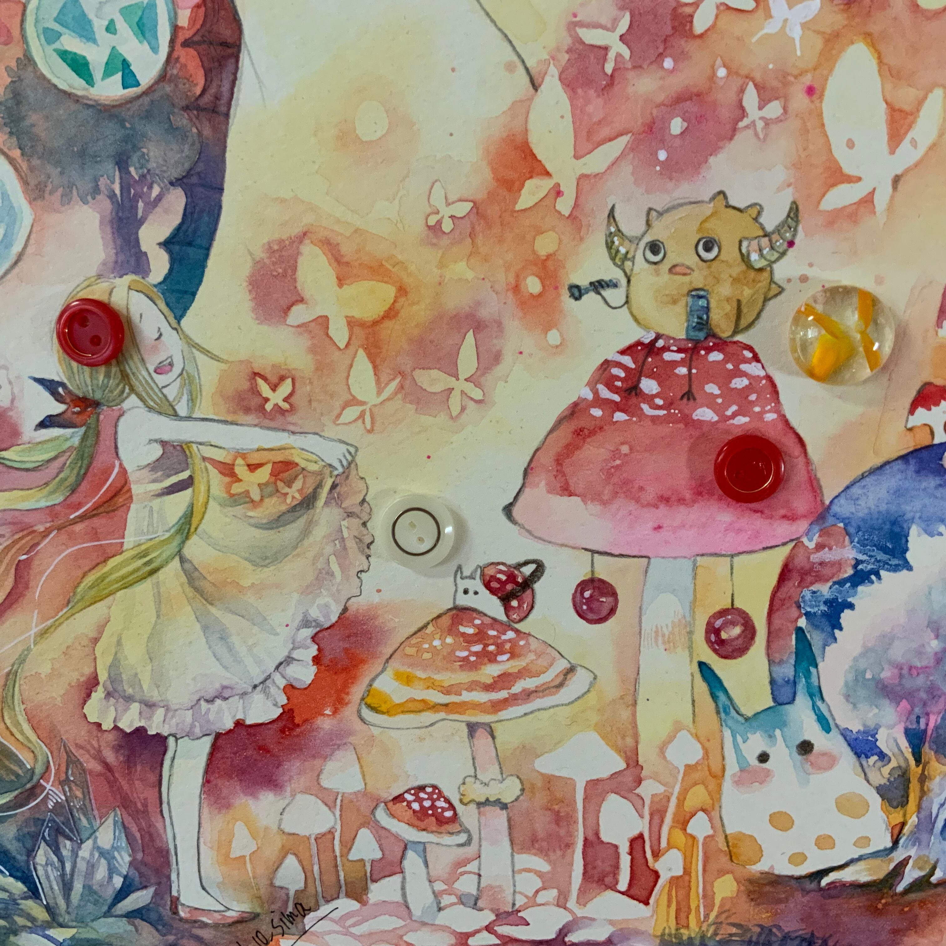 たくさん生えたきのこや飛び交う蝶の様子も可愛らしい、華やかなイラストアートです。