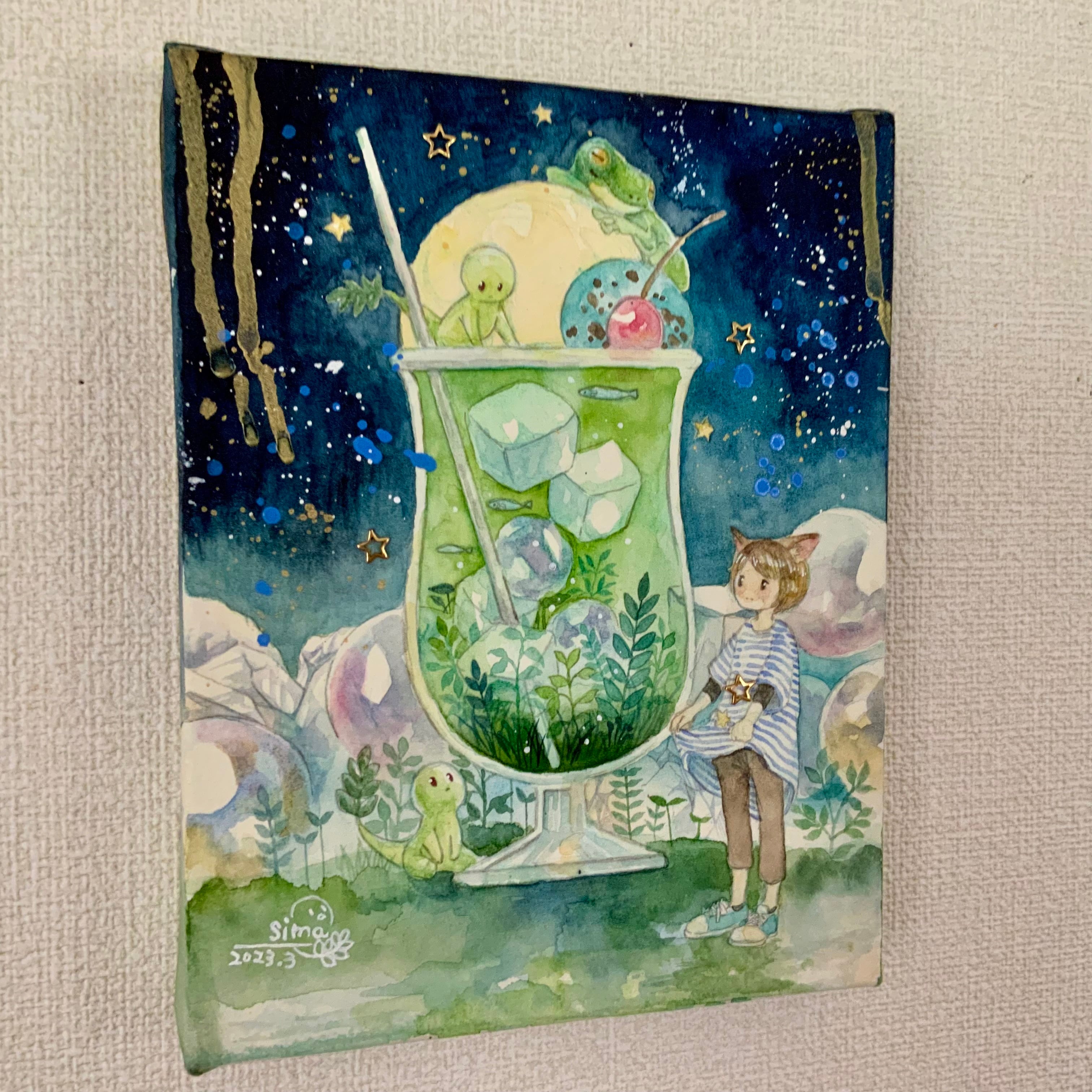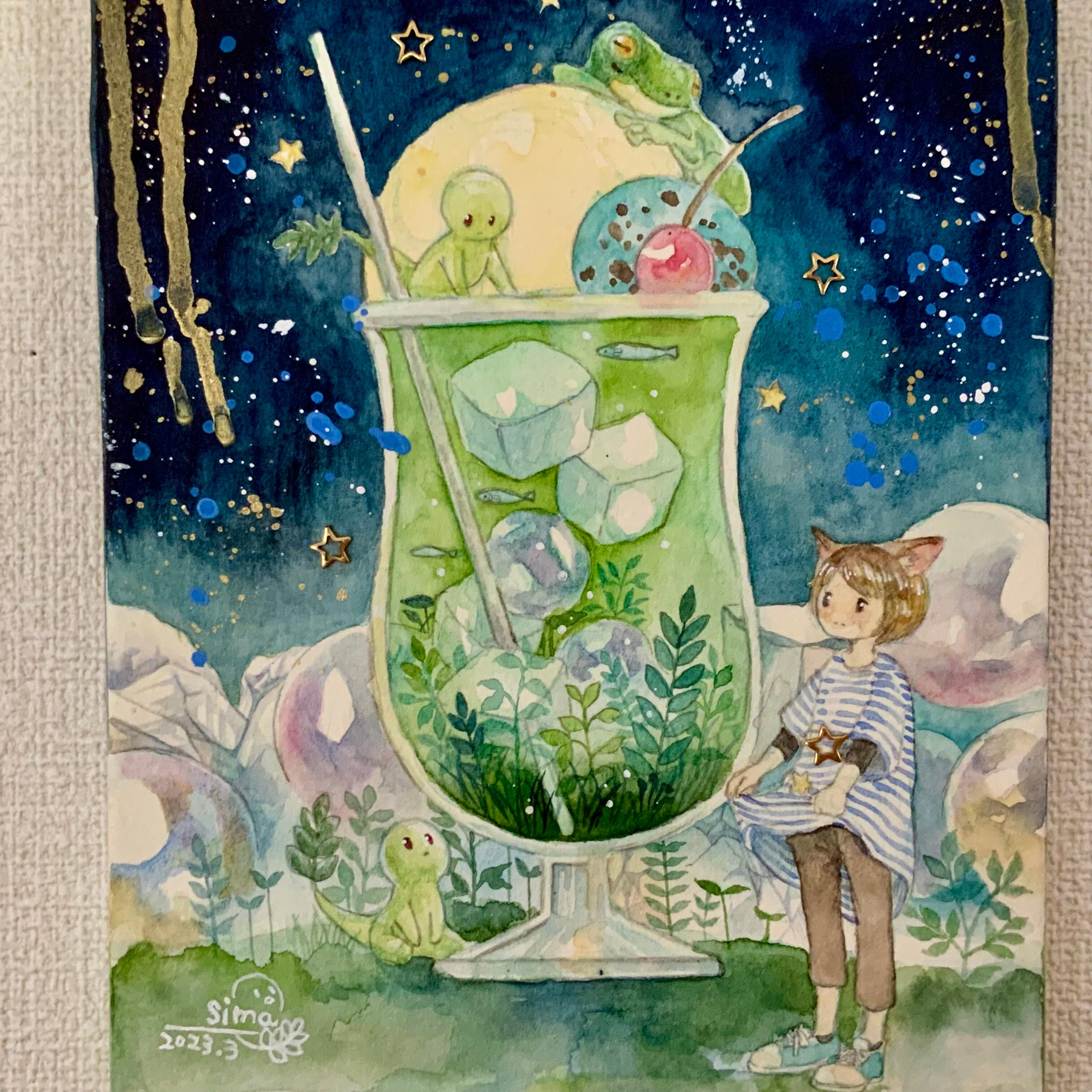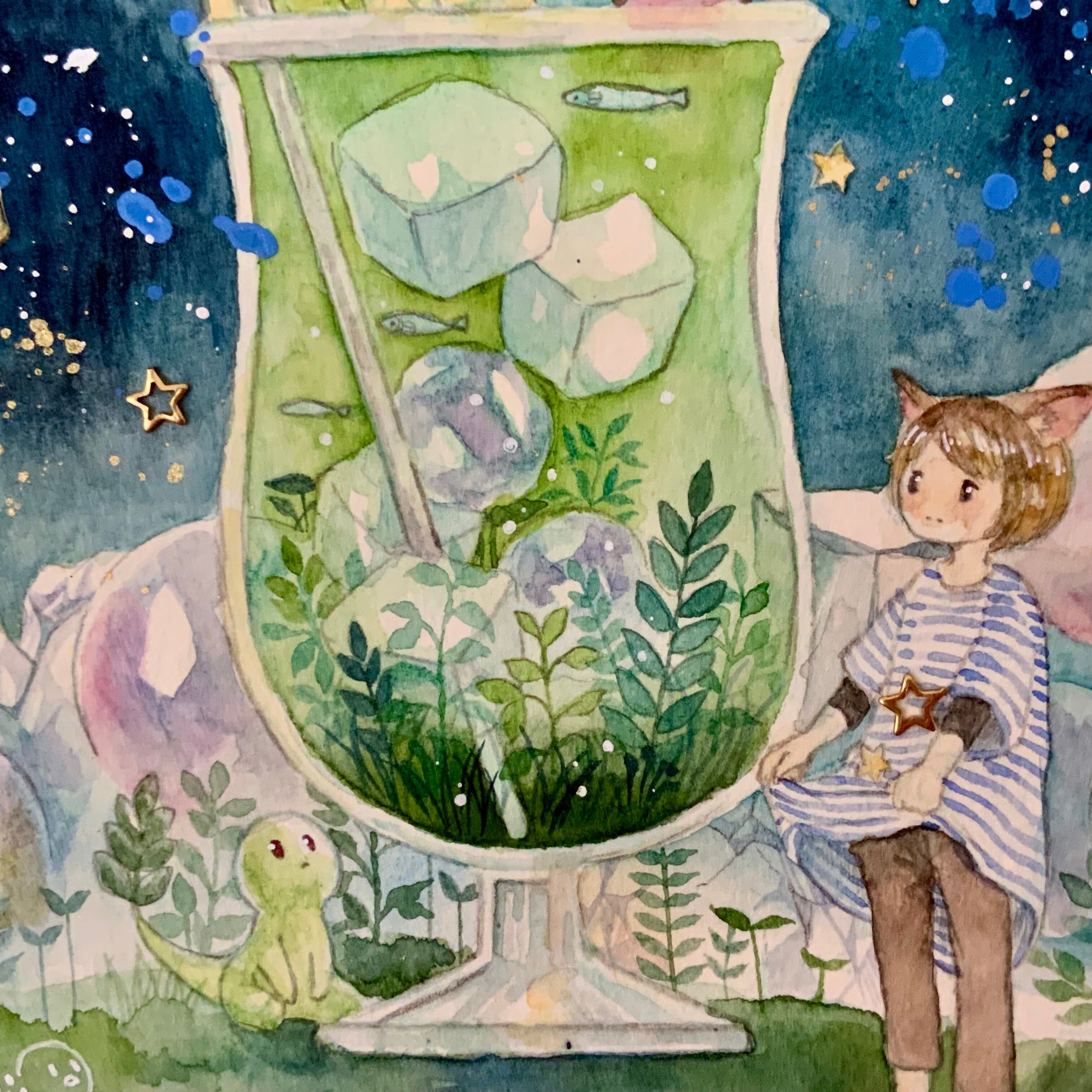クリームソーダを水槽に、背景を宇宙に見立てた