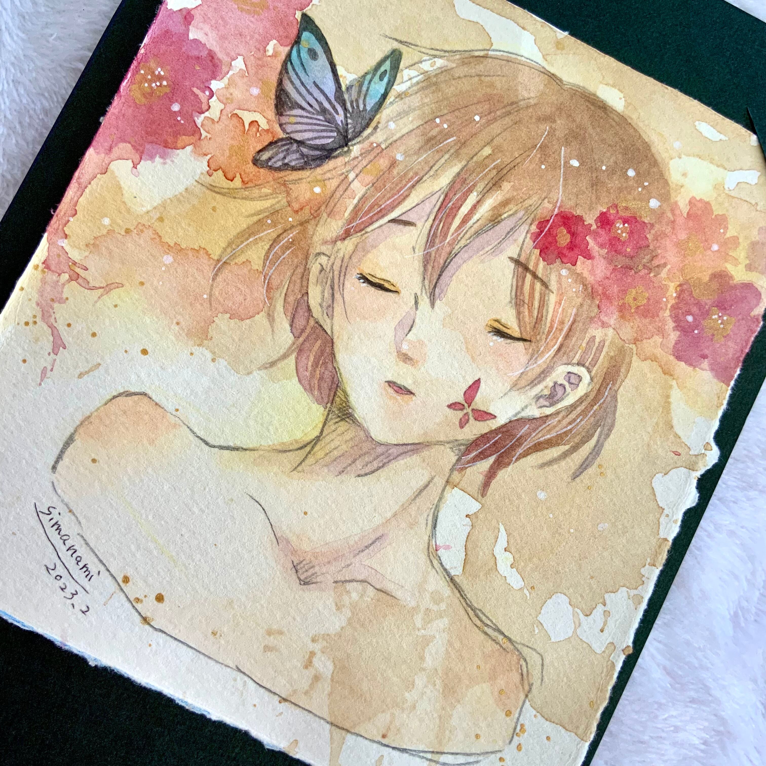 水彩で描いた花と蝶のイラスト原画。