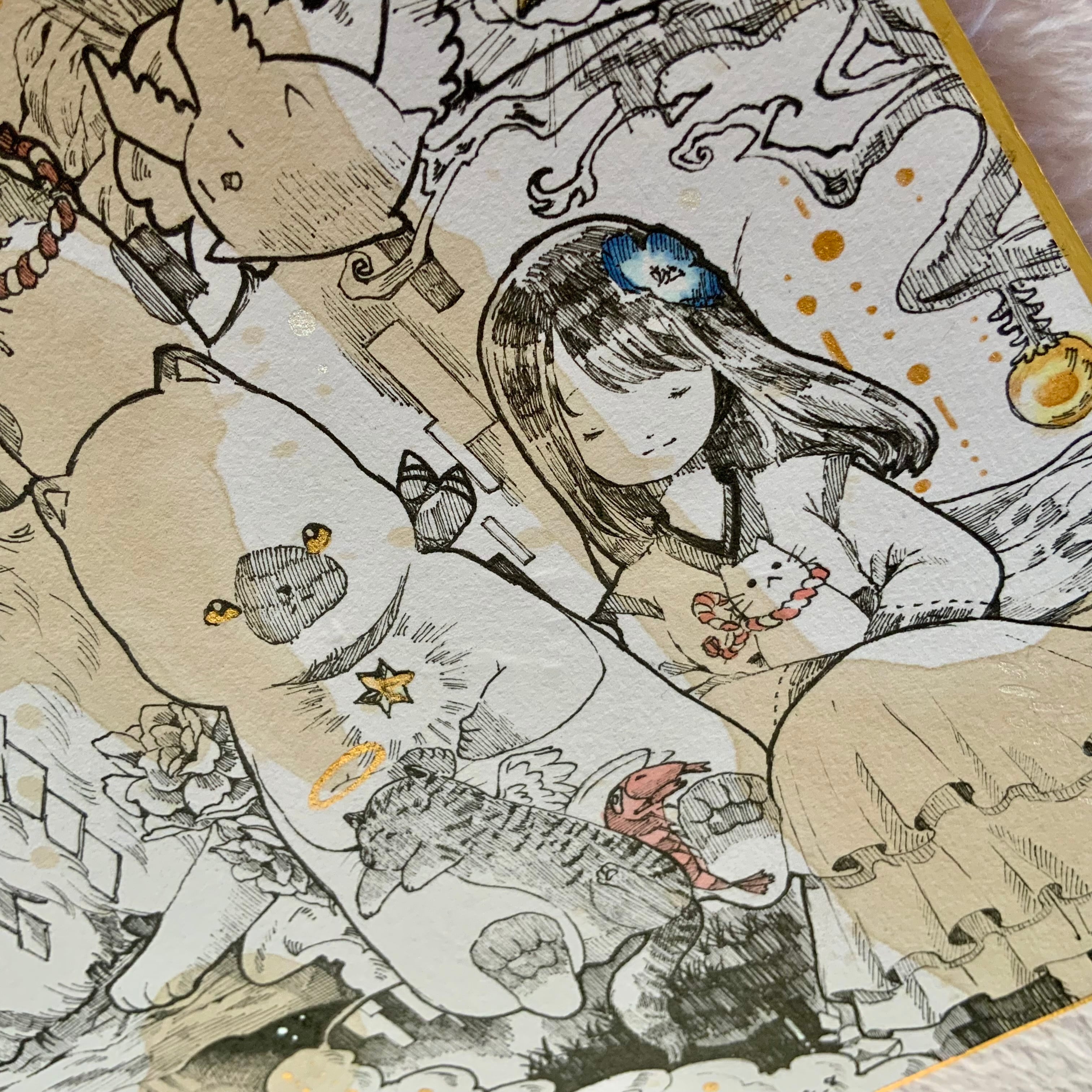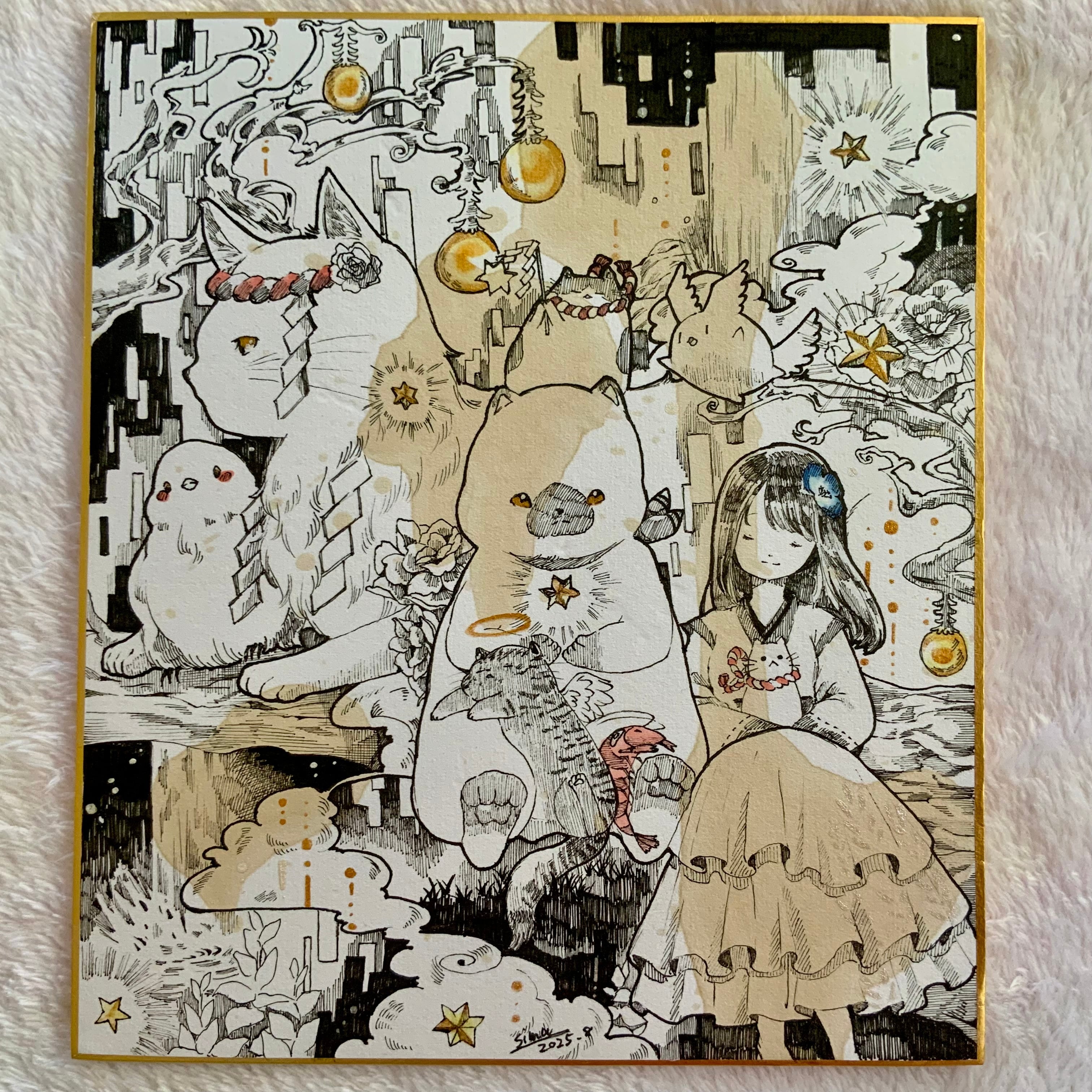 大きめの色紙にペン画で丁寧に描いた和風ファンタジーなイラスト原画。