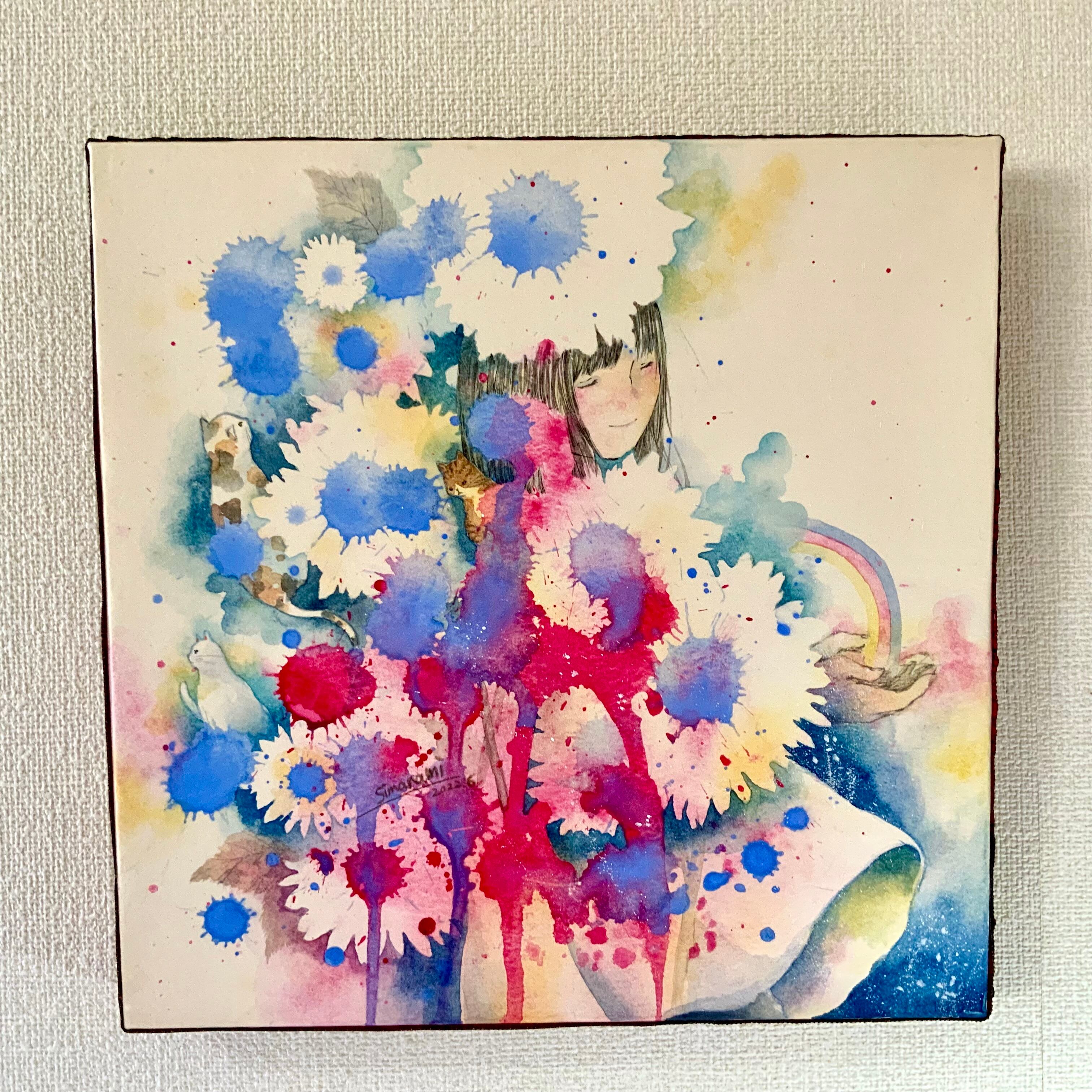 水彩絵の具で鮮やかな花と猫を描きあげたアート原画。