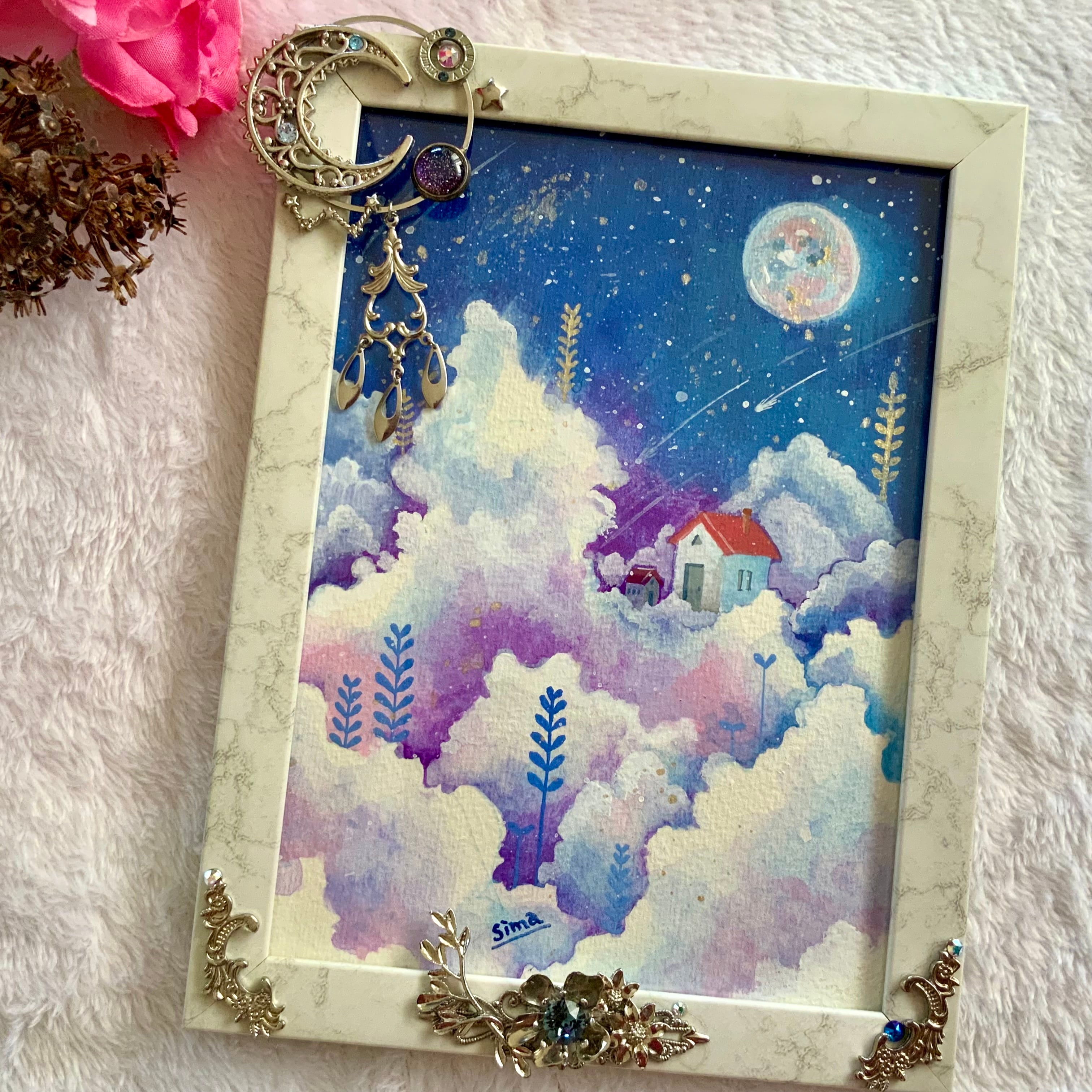 アクリル絵の具で描かれた幻想的な雲と空の風景。白いふわふわの雲が広がる夜空に、ゴールドの星々や月がきらめき、神秘的な世界が広がります。鮮やかな青色の空と、繊細な紫やピンクのグラデーションが、見るたびに新しい発見をもたらしてくれるでしょう。