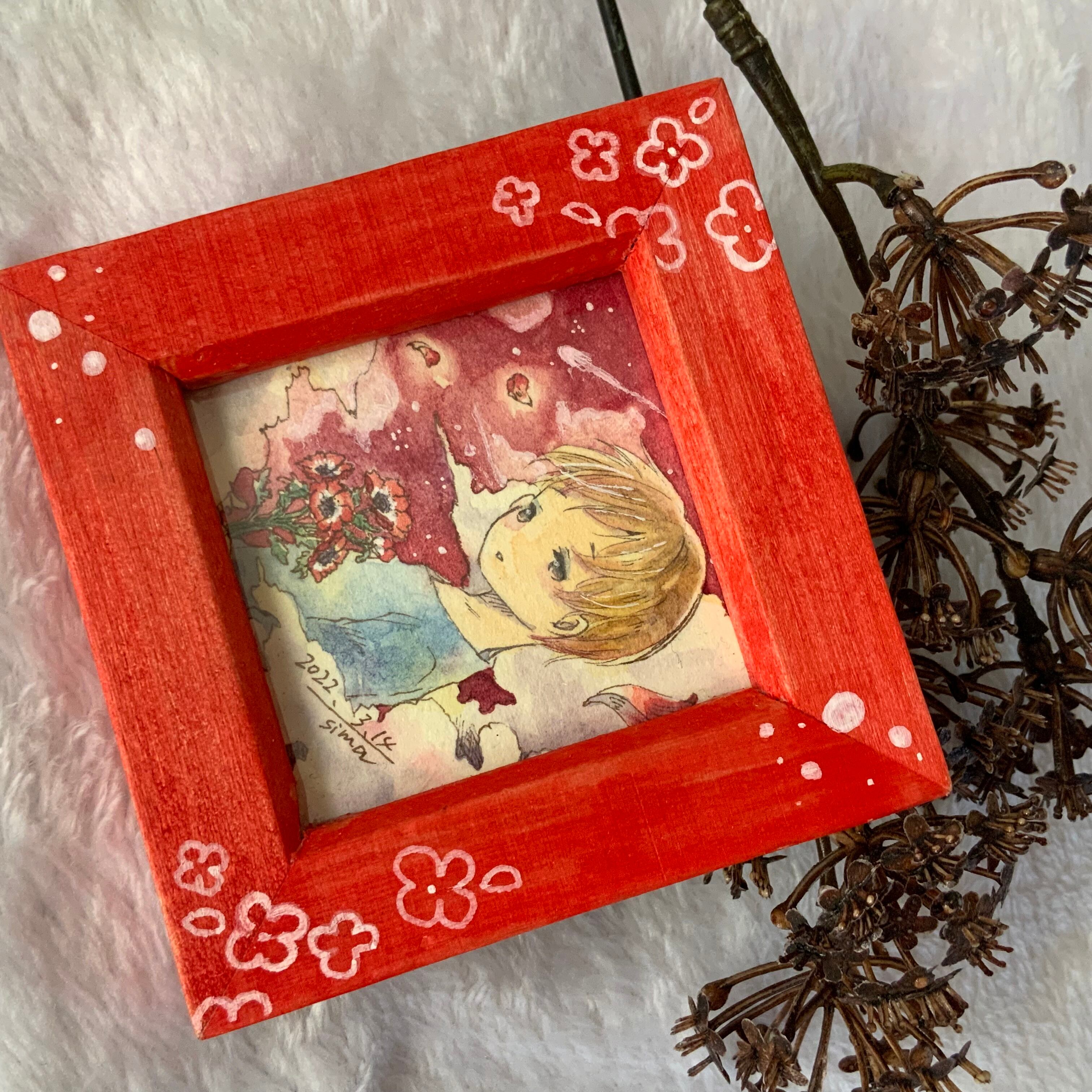 赤い花を手にしながら静かに世界を眺める姿は、シンプルながらも深い感情を呼び起こす、水彩の美しいさと見る人に安らぎを与えてくれるようです。