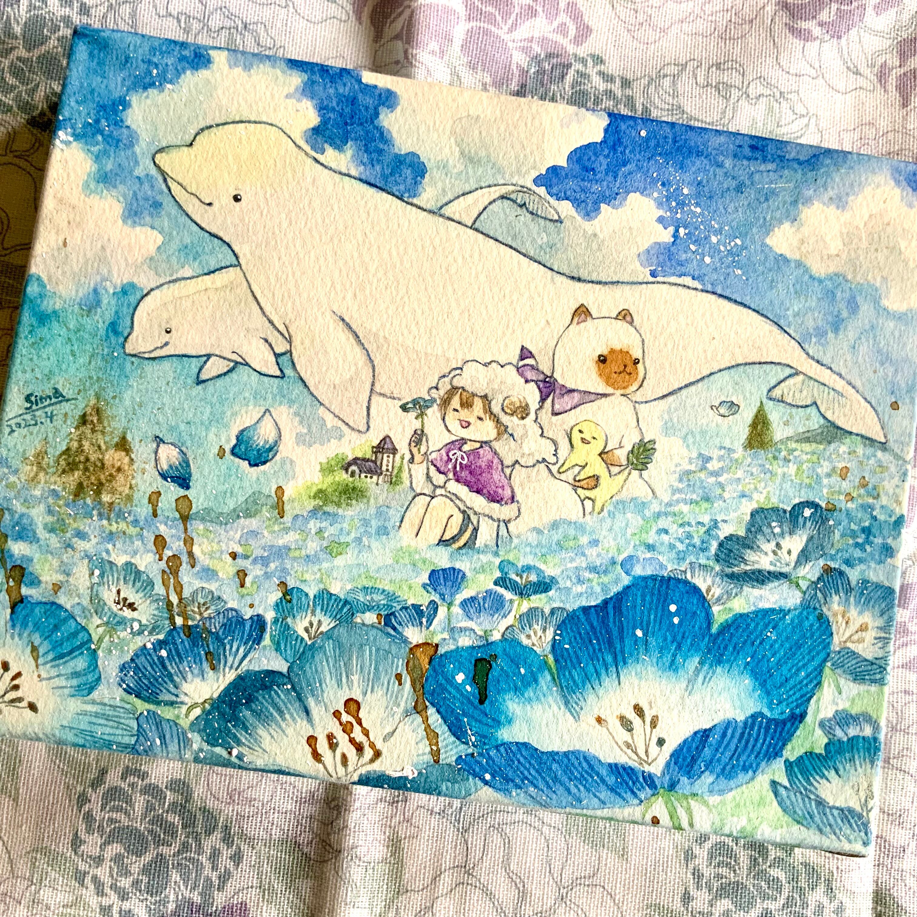 画材…木製キャンバス、水彩紙(ワトソン)、透明水彩、顔彩、コーヒー